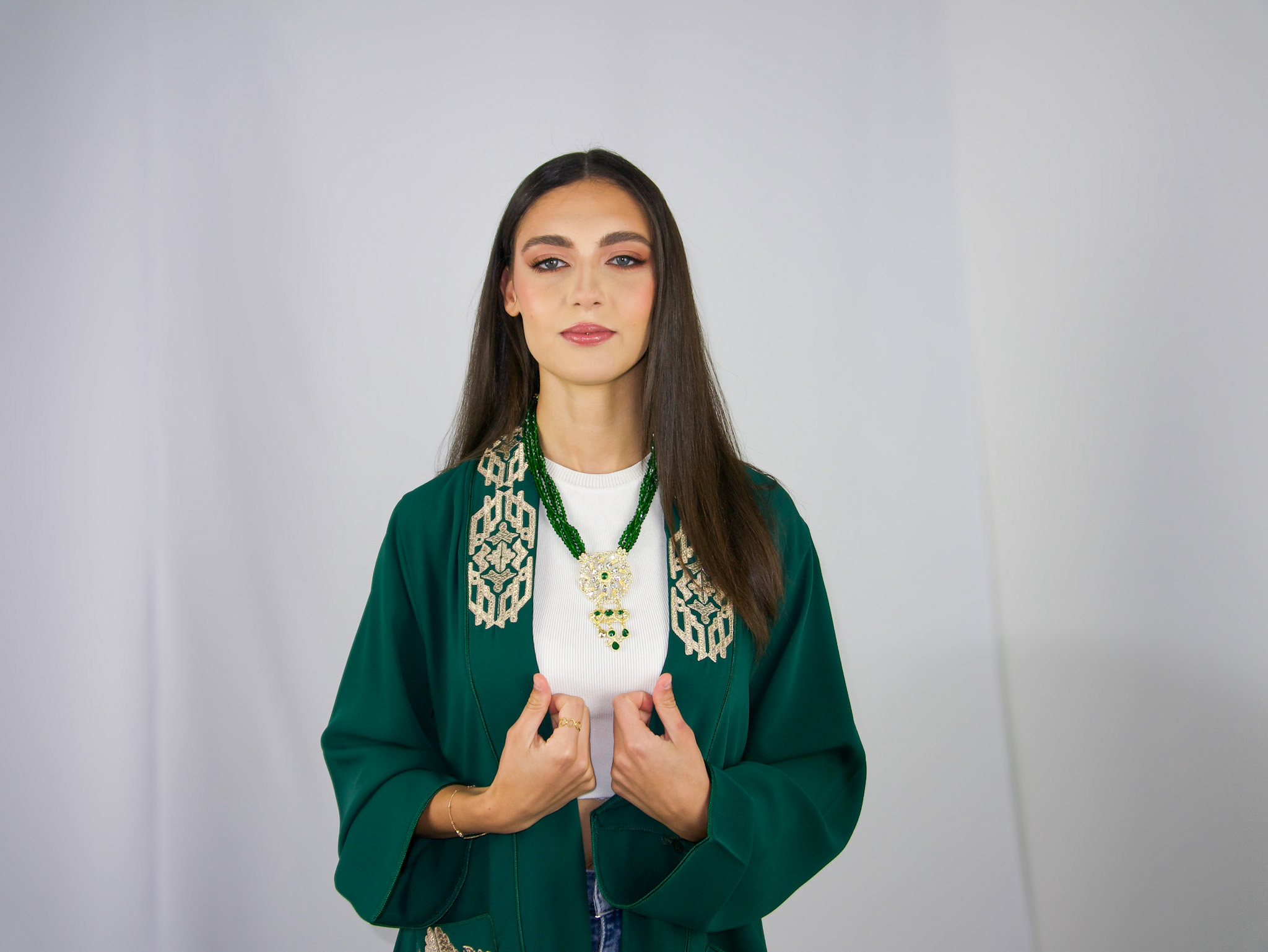 Nos artisans qualifiés, animés par la passion et le savoir-faire, donnent vie aux traditions marocaines à travers des techniques de broderie, de tissage et de couture raffinées. Chaque vêtement est un chef-d’œuvre, méticuleusement confectionné avec souci du détail et des matériaux exquis qui respirent le luxe et le confort.