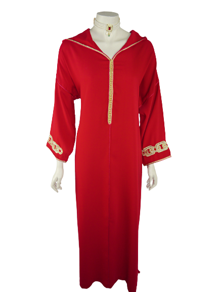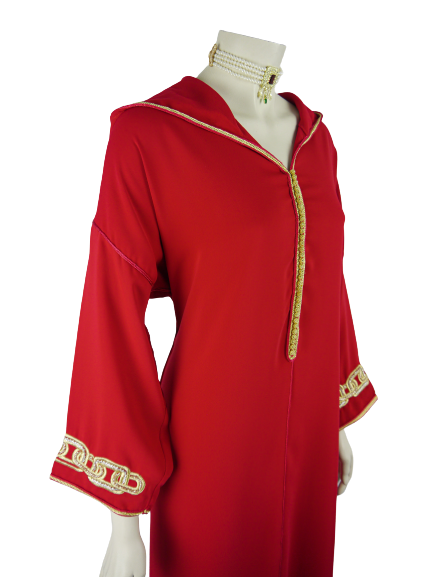 Djellaba avec broderie dorée, confectionnée dans un tissu léger et fluide. Elle est dotée d’une coupe ample et longue qui la rend agréable à porter en toutes circonstances..